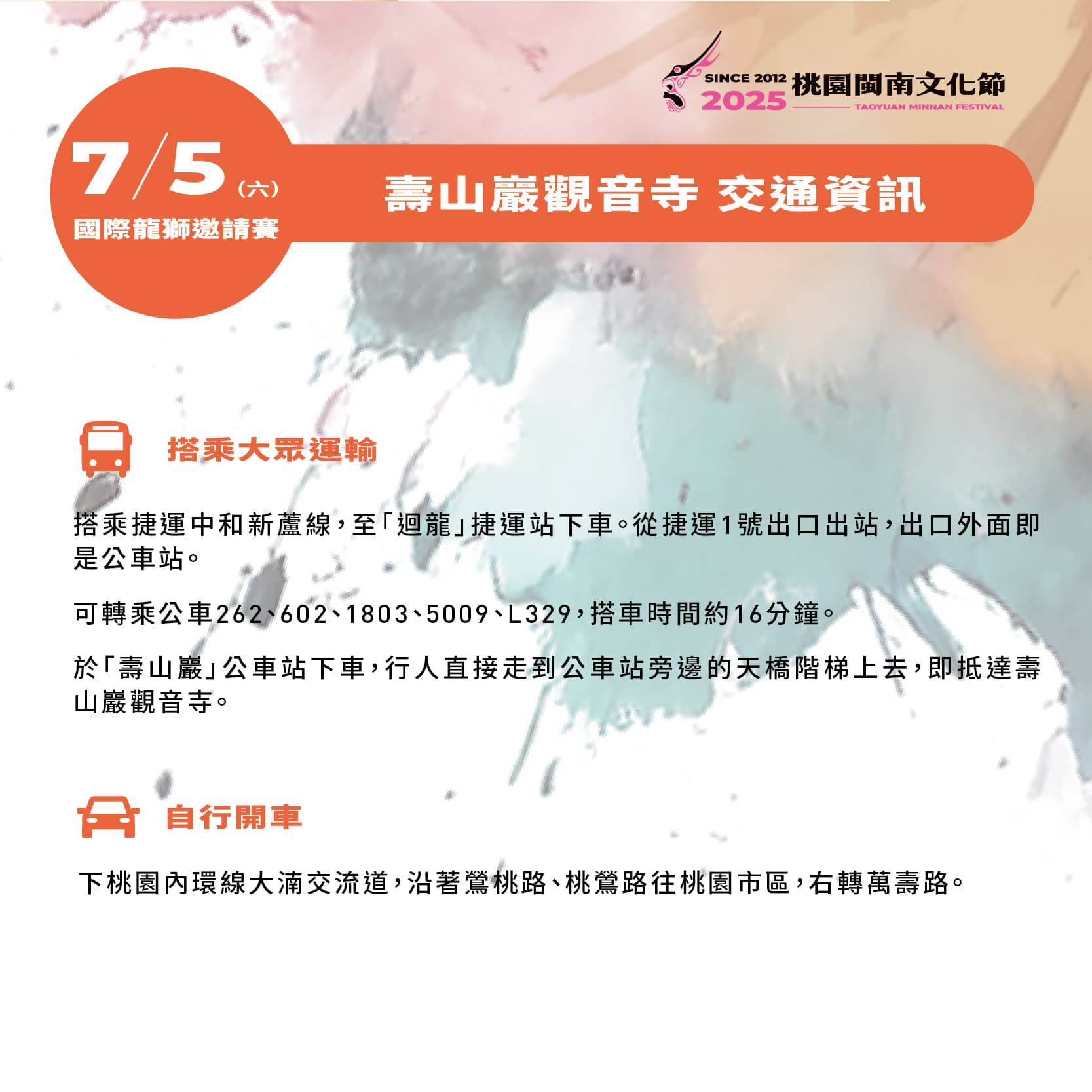 下「桃園內環線大湳交流道」→ 鶯桃路 → 桃鶯路(往市區方向)→ 右轉萬壽路就到!